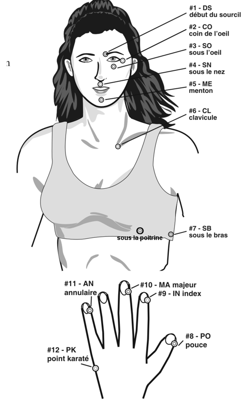 Avec l’E.F.T., nous stimulons des points précis au niveaux des méridiens, qui correspondent aux points utilisés en médecine traditionnelle chinoise. Nul besoin de connaître les 365 points d’acupuncture puisque Gary Craig a élaboré un protocole simple à partir de quelques points. Nous utilisons deux doigts pour élargir la zone d’impact sur ces 15 points et ainsi effectuer une ronde des points. Chaque point est stimulé plusieurs fois.