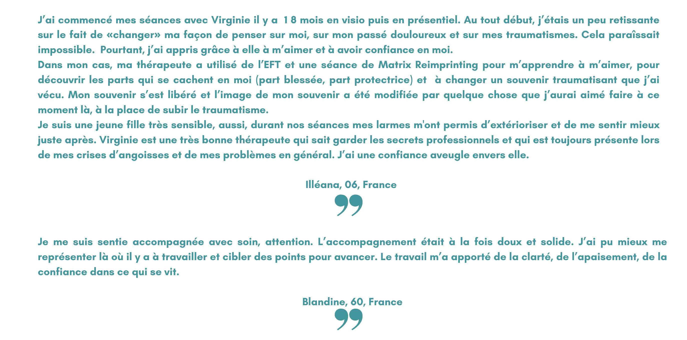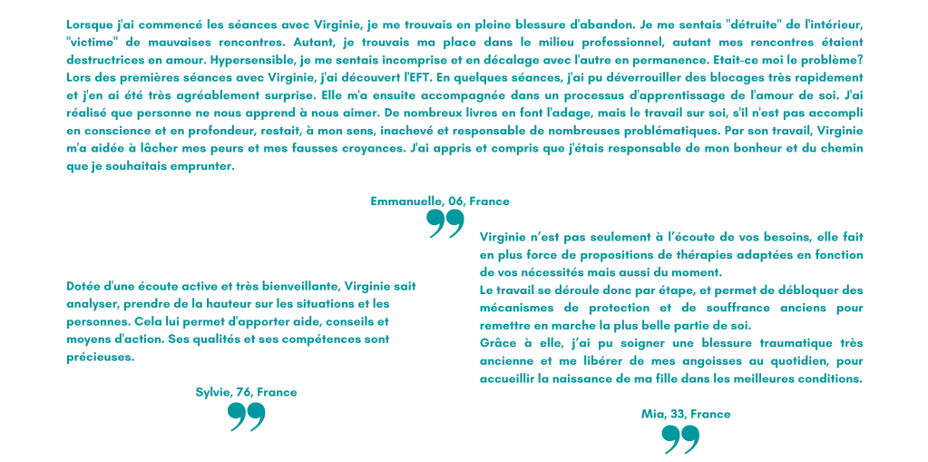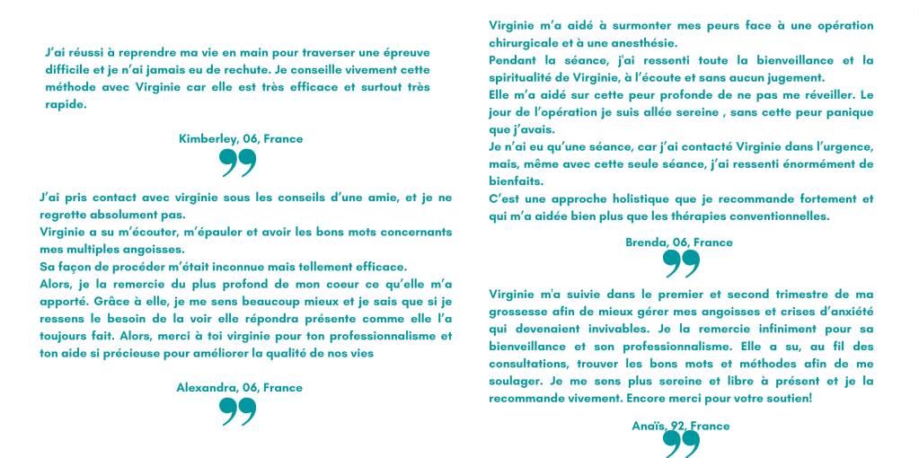 - Liberté de choix de chacune des parties d’arrêter si nécessaire les séances : La thérapeute s’autorise à proposer à son patient de consulter un autre thérapeute, toujours dans le but d’apporter une solution adaptée à ce dernier. Le patient peut arrêter à tout moment le suivi. Il est attendu néanmoins que l’annulation d’une séance se fasse au moins 48h à l’avance.